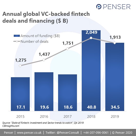 Aside from these unicorns, the fintech industry overall has seen considerable investment. Overall, global investment in fintech was at $135.7 billion across 2,693 deals (largely driven by FIS’s acquisition of Worldpay for $42.5 billion and First Data’s acquisition by Fiserv for $22 billion). VC-backed fintech deals and financing hit close to $35 billion in 2019 across almost 2,000 deals. This was still lower than the peak hit in 2018, but still significant.